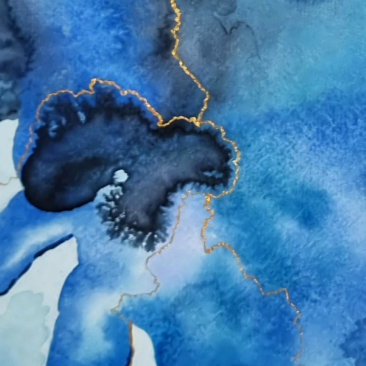 Aquarelle et tempera, couleurs bleu et doré, peinture abstraite contemporaine et vibratoire. Extrait 2 d'Allégria