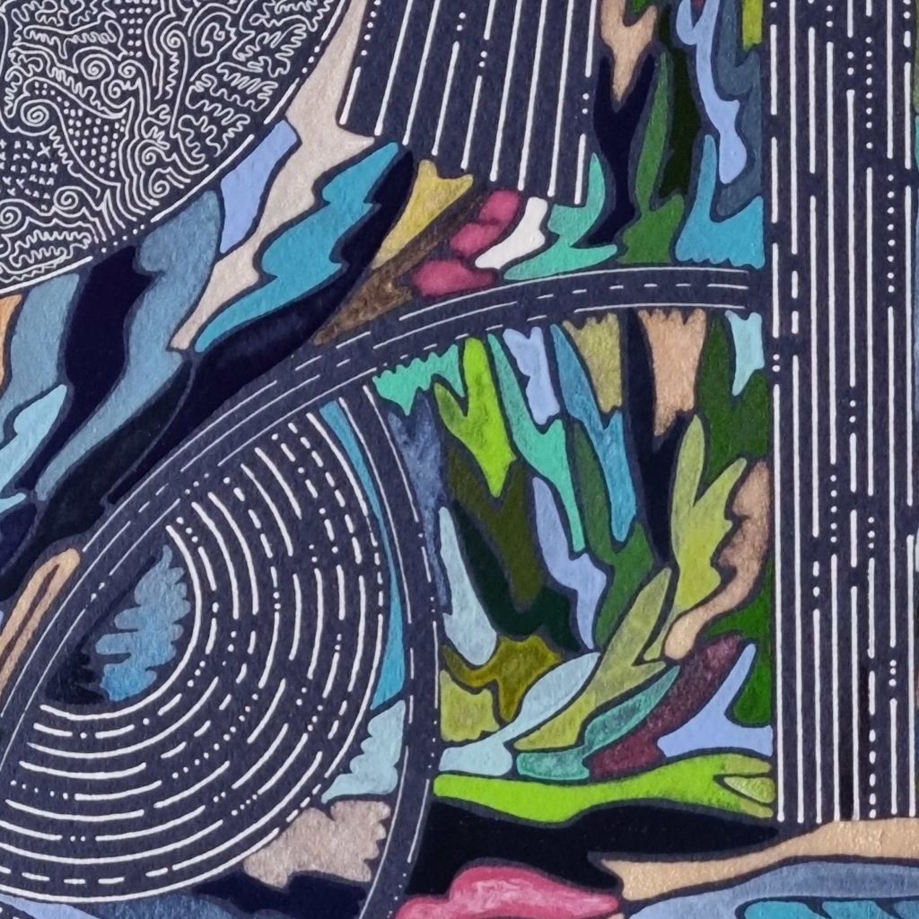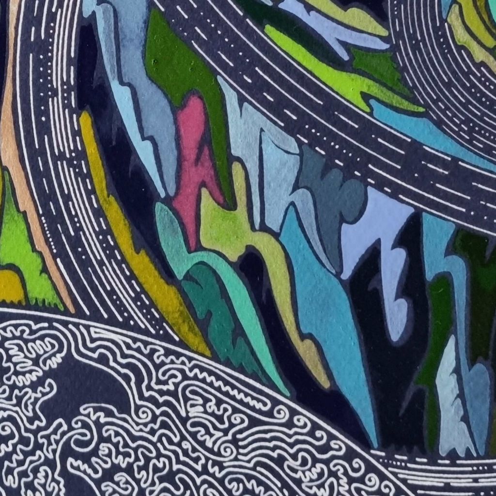 Aquarelle abstraite contemporaine, verts,bleu sur fond bleu marine. Format 70 x 90 cm. Extrait 1
